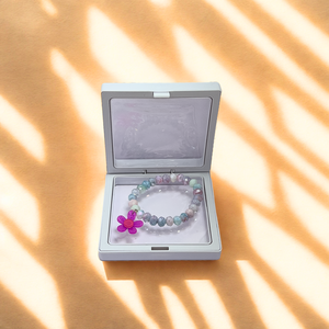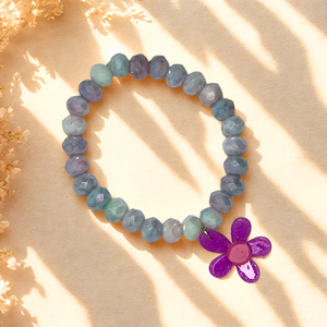 Step into playful elegance with our Aura Bloom Bracelet – Amethyst Bloom Charm. This handcrafted beauty features a mix of faceted ombré beads in soothing lavender, teal, and icy blue tones. At the center blooms a glossy amethyst-toned floral charm that adds a pop of whimsical charm to your everyday look.