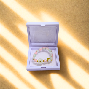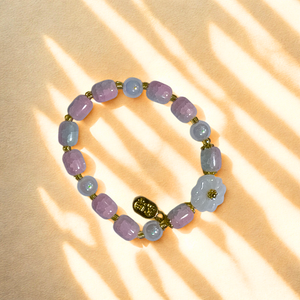 Evoke calm and class with our Aura Bloom Bracelet – Lavender Bliss Flower. Crafted with alternating lilac and icy blue faceted beads, this bracelet blossoms with a delicate frosted flower charm at its center. The subtle golden accents bring an air of luxury to this pastel-perfect piece.