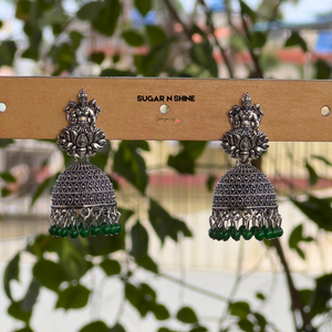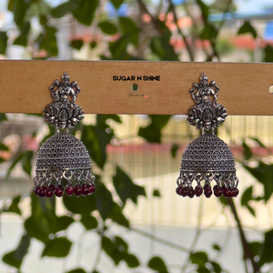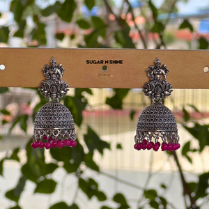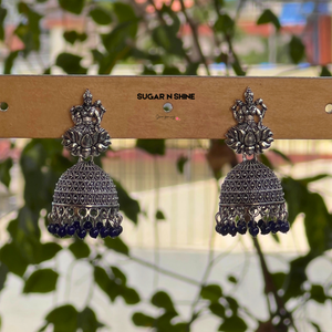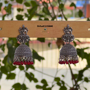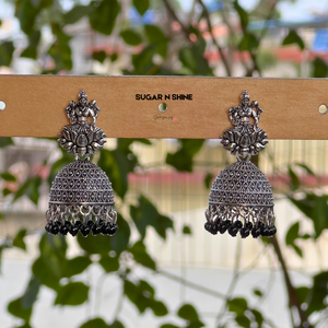 Channel divine grace with our Divine Lakshmi Silver Jhumkas β a celebration of traditional heritage and temple craftsmanship. These oxidised silver-finish earrings feature Goddess Lakshmi seated on a lotus and are adorned with intricate filigree dome work and vibrant bead danglings. Lightweight yet statement-worthy, they're perfect for poojas, festivals, and bridal events. A spiritual touch meets elegant style.